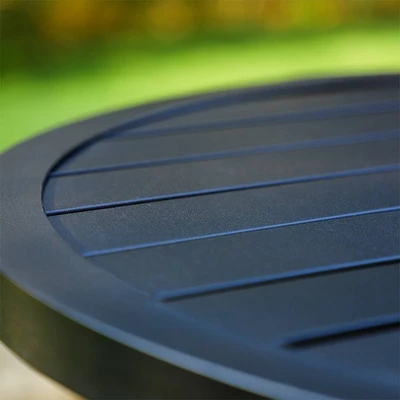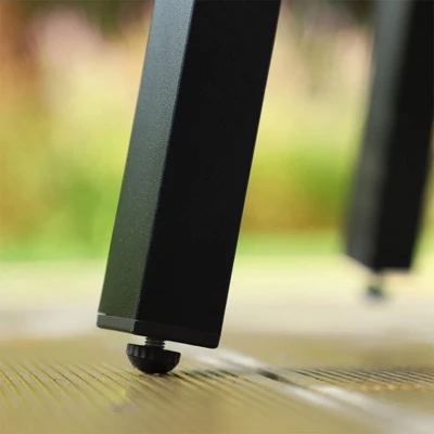 The small side table is made of steel. Matte powder-coated black finish frame, UV and fade resistant. Skid resistant feet for uneven ground and against floor scratching.