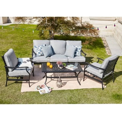 - Set includes: one 3-seater outdoor sofa, 2 armrest chairs, and one coffee table