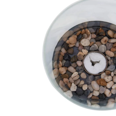 Recreate the soothing ambiance of a fireplace without the smoke, soot, ash, and the smell of melting wax with the Large Danya B. Indoor / Outdoor Portable Tabletop Fire Pit. The elegant contemporary design of metal and glass instantly elevates the sophistication of any indoor or outdoor space while also doubling as a fantastic heat source. The cylindrical glass is easily removable, while the decorative rocks that surround the fire add just the perfect touch of natural. Reusable fiberglass for use with ethanol fuel and snuffer are included. Easy to integrate into any décor and dinner party, on your coffee table, end table, or dinner table, this bio ethanol fireplace will light up your room and heat up your life!