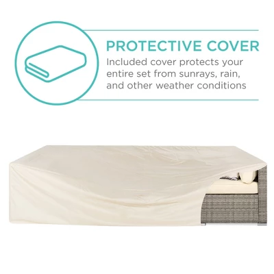 Modular sectional with all-weather wicker and extra plush cushions. Arrange your modular set on the patio for parties, or find more ways to arrange it on your lawn or poolside. An included protective cover protects your entire set from sunrays, rain, and other weather conditions. Quality design includes handwoven wicker, accent pillows, comfortable cushions, and aluminum feet. The table’s durable glass top provides a smooth surface for food, drinks, and decor. Ships and arrives in 3 separate boxes. Delivery times may vary per box.