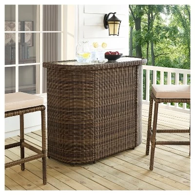 Spend warm summer days and balmy summer nights in luxury with the Bradenton Wicker Bar from Crosley. All-weather wicker combine elegant lines with casual comfort in one versatile design with dozens of possibilities. The shelves provide plenty of room for storing barware and spirits. This full size bar is ideal for designing a cozy entertaining nook in any outdoor environment.