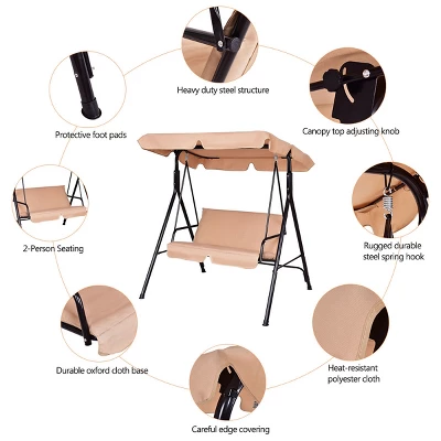 Our Two Seats Swing Chair Will Be A Excellent Addition To Any Outdoor Living Space, Such As Garden, Yard, Balcony And Pool Side. This Swing Chair Provides Two Comfortable Seats And You Can Enjoy The Outdoor Beautiful Scenery With Your Partner. With A Top Canopy, This Item Can Protect You From Ultraviolet Ray And Drizzle. Steel Frame Is Solid And Durable, You Can Enjoy Using This Swing Chair For A Long Time. Seat And Back Cushion Can Add The Comfort When You Seating On It. Do Not Hesitate To Buy One To Enjoy Your Outdoor Scenery
