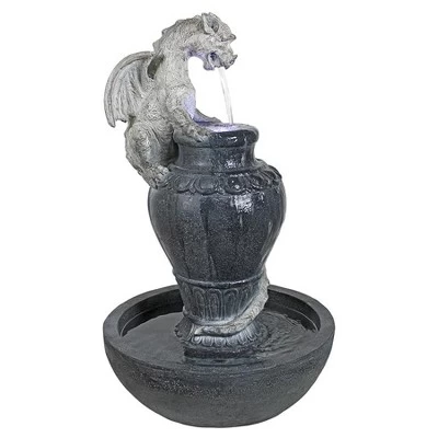 Our steely-eyed Gothic Viper Dragon gazes into the legendary illuminated pools from his perch, this fabled winged serpent is said to foretell the future. This Design Toscano almost yard-tall dragon fountain is intricately sculpted from the beast’s spiny wings to the artistically rendered, dark and mysterious water urns that boast a pool of cascading water lit from below by the included LED light kit so you and your guests can commune well into the evenings! Cast in quality designer resin with an amazingly detailed, hand-painted finish, this Design Toscano exclusive sculpted fountain is an investment in functional garden art. UL-listed, indoor/outdoor pump. Simple assembly required. Bring inside during freezing temperatures