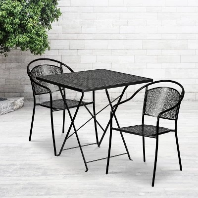 Brighten up your patio space with this beautiful patio table set. This colorful set will enhance your bistro, cafe, restaurant, hotel or home patio space. With the convenience of a folding table you can use it as a temporary placement or fold away for storage or cleaning the space. Quickly unfold the table by pulling the center brace. The patio chairs stack for storing. The frames are designed for all-weather use making it a great option for indoor and outdoor settings. For longevity, care should be taken to protect from long periods of wet weather. The possibilities are endless with the multitude of environments in which you can use this table, for both commercial and residential spaces. Additional Features: Patio Chair, 300 lb. Weight Capacity, Stacks up to 8 Chairs High, Round Back, Integrated Arms