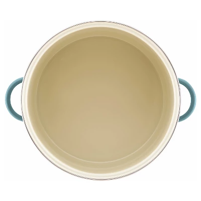 - Stockpot constructed from durable steel with an easy-cleaning cream-colored enamel interior
