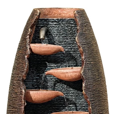 The intricate arrangement of bowls in this outdoor/indoor fountain allows water to cascade down a series of tiers. The trill of the water creates a refreshing, serene atmosphere. Water pools repeatedly in each tier. Each tier features a carved spout that the water flows.