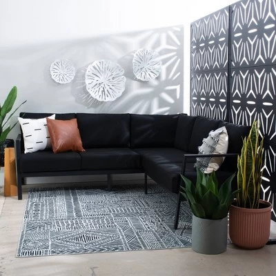 This modern sectional sofa creates a home base for your family and friends during outdoor parties. The sturdy aluminum frame supports up to 5 comfortably, while the black powder coated finish protects against rust and lends itself to a sleek aesthetic. The plush cushions are upholstered in black Sunbrella⢠fabric that is fade, stain and mold resistant, so you can enjoy a like new look and feel for years to come. Matching chairs, tables and more are also available for purchase.