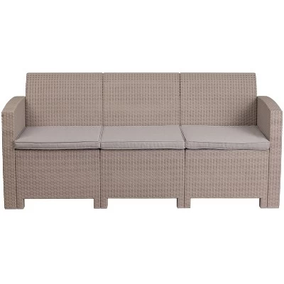 Well composed with modern materials and classic design, this 3-seater sofa is ideal for relaxed settings in the 21st century. The contemporary faux rattan resin frame is complimented by a traditional wicker pattern, giving this sofa a vintage look with present day functionality. Crafted for all-weather use 365 days a year, the cushion covers are removable for convenient cleaning so you can keep your chill space looking cool. This outdoor sofa is chic enough for the indoors, or wherever you want to establish an easy going vibe.