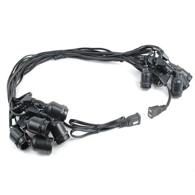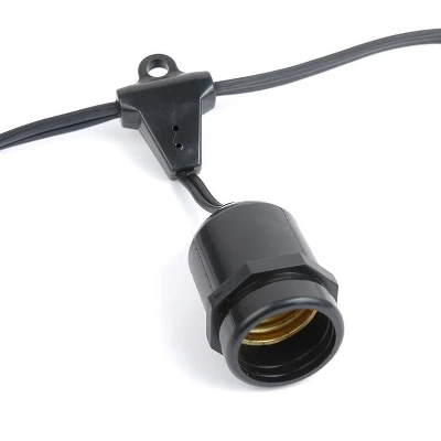 Novelty Lights clear S14 medium base bulbs string light set with 15 bulbs on 48′ of commerical grade black wire. These are our most durable string light sets and are suitable for year round outdoor use and permanent lighting applications. Each set includes 15 (10 extra bulbs included) S14 medium base bulbs on a commerical grade black wire stringer with 15 sockets that are spaced 36″ apart. These clear S14 light strings have long-lasting 6,000 hour bulbs and are on a heavy duty 16 gauge SPT-2 black wire stringer. Each socket is made with PVC plastic to provide a water-tight seal and to ensure no defects due to weather. These durable and heavy duty light strings will provide you with years of maintenance free use. Perfect to use on any patio, restaurant, backyard, pergola, wedding venue, or town square for hanging outdoor string lights.