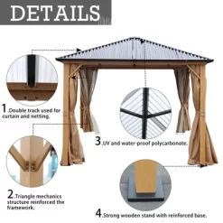 Aoodor Gazebo Polycarbonate Roof, Wooden Print Aluminum Frame With Mosquito Netting And Curtain
