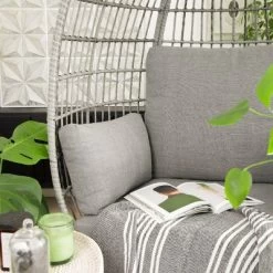 Oversized Egg Chair Style Wicker Chair With Canopy & 4 Cushions -Grey
