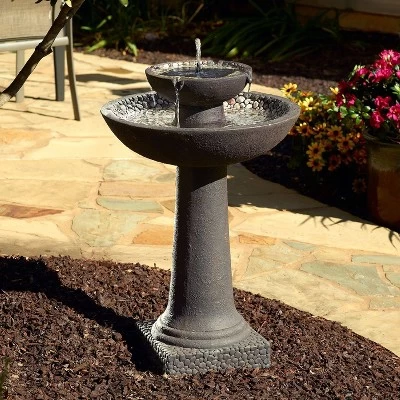 The Riverstone 2-Tier Solar-On-Demand Fountain is a classic, elegant fountain with a brown finish. This fountain creates soft ambient sounds and is sure to add peace and relaxation to any garden or outdoor area. Solar on Demand allows you to choose when you want your fountain to work. Charge battery in the sun and use the stored energy to power the fountain in cloudy conditions or during the evening. Battery will fully charge in 1 to 2 sunny days and will provide 6 hours of running time.