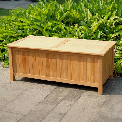 Durably constructed of high-quality teak wood, this weather-resistant Sherwood teak outdoor storage from Cambridge Casual makes a statement for your outdoor space while providing a smart storage solution for extra outdoor essentials. This wooden outdoor chest can be left outside to weather to a pleasant gray or if desired, teak oil can be applied to keep its original golden brown color. Comes with soft closure hydraulic hinges on lid. This deck boxes also serves as a side table when the lid is closed, a great multifunctional backyard piece.