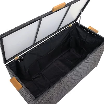 Have a place to store and organize your seasonal recreation and decor items with this versatile faux wicker deck storage box. This versatile storage bin can be used both indoors and outdoors and features a convenient hinged lid to open and close as needed. Made from a steel frame wrapped in resin wicker, this storage box is able to easily withstand the elements outdoors. The storage box also has a water-resistant liner to provide additional protection against the elements when in use. It adds traditional style with modern and durable materials as it features a strong steel frame wrapped in strong resin wicker that will stay smooth to the touch and won’t splinter or fray. The acacia wood handles also add natural appeal to this stylish patio storage box. This attractive storage solution is perfect for containing outdoor tools, lawn equipment, pool accessories and more. Place in your garden, patio, yard, or landscaping to keep your seasonal things nearby!
