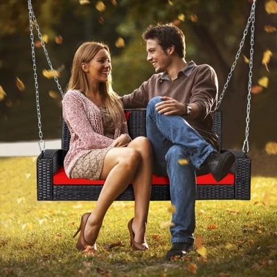 The 2-seat design allows you to swing with your family or friends and have a nice chat. And the soft seat and backrest cushions effectively relieve your tiredness during swinging. In addition to the comfortable seat, the porch swing bench also features heavy-duty steel frame and built-to-last PE rattan, which enable it to accompany you all year around. And two 7.9 ft steel chains ensure high safety and strong weight capacity which is up to 800 lbs. Other than that, you can hang this porch swing in any places you want, such as courtyard, front porch or balcony.